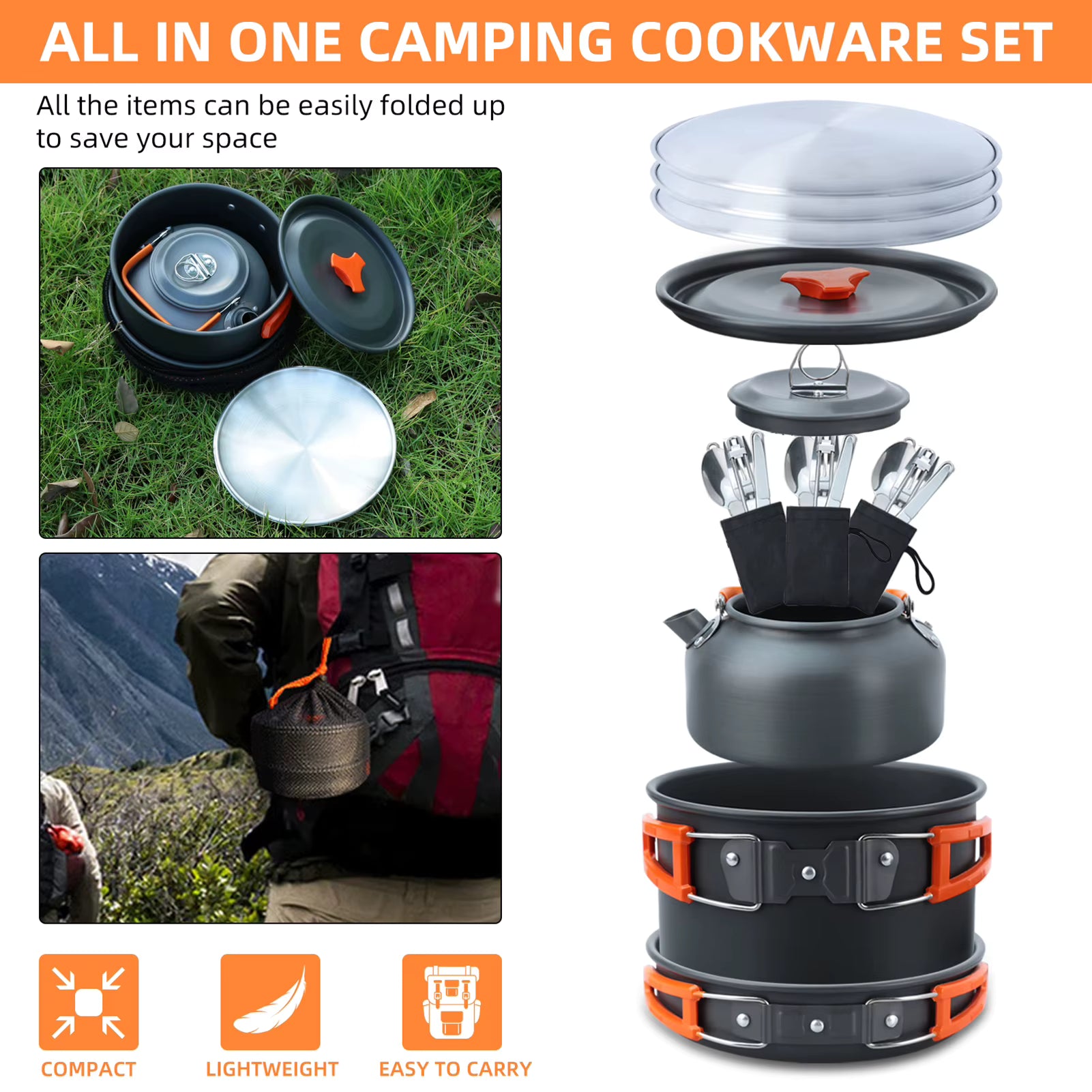 Compact, stackable and ready for the trail — this all-in-one camping cookware set gives two people everything they need to cook and eat outdoors: frying pan, soup pot, kettle and a full set of foldable cutlery plus plates. Lightweight, nestable and built for backpacking stoves or campfires.